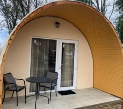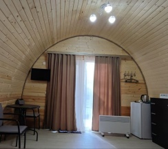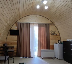 Купольный домик двухместный 14м² с одной двухспальной кроватью 140*200см. И санузлом. оснащен всем необходимым: телевизор, холодильник, кондиционер,столик,стулья,фен,чайник,кружки, постельное белье,полотенца, шампунь,гель,мыло и тд.