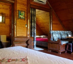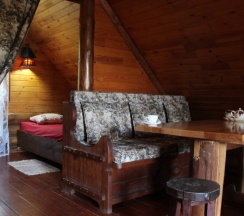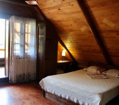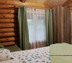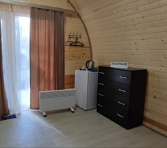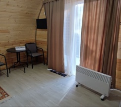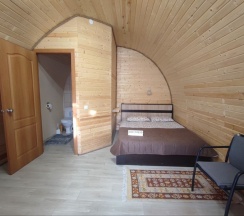 Двухкомнатный 4х местный номер на втором этаже двух этажного сруба 25м², с двумя двухспальными кроватями 140*200см. Комнаты разделяет ширма, в номере имеется всё необходимое: телевизор, холодильник, кондиционер, чайник, постепенное бельё, полотенца, мыльные принадлежности.