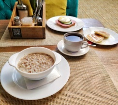 Теперь о завтраке. Девушка сказала, что ресторан завтраки не обслуживает, т.е. разносят только по номерам. Я удивилась. Деньги проплатили с завтраком... Еще, она предложила мне завтрак забрать с вечера :) Утром, говорит, разогреете :) Нет, уж! Завтра принесете свеженький! Утром в 8-30 принесли завтрак: рисовая каша в полиэтиленовой баночке, два бутерброда с прослойкой тоненькой колбаски и кексик. Пакетик чая и два пакетика сахара. А где фрукты, сосиска, кусочек масла, сыра? Заплатили 4200. Может наша сосиска по пути в наш номер где то вышла :)