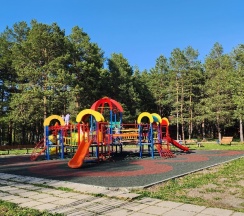 Территория красивая. Детская площадка с качелями.