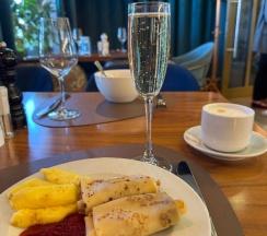 Завтраки - это то, за чем сюда можно отдельно возвращаться! На первом этаже отеля находится шикарный ресторан Светски, и спускаться сюда за свежими блинчиками и сырниками, приготовленными специально по вашему заказу омлетом или глазуньей, да еще и запивать это всё не только чаем / кофе, но и игристым - однозначно залог отличного дня 🤌🏻
