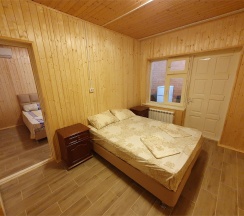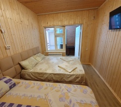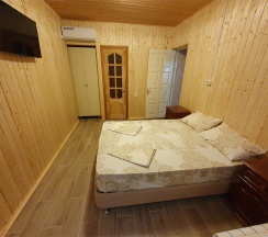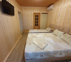 Номер для большой семьи или дружной компании. В номере: мини кухня. Столовые приборы, холодильник, два телевизора, две сплит системы, два совмещенных душа и туалета, прикроватные тумбы, столы и стулья. При заселении удерживается залог размере 5000 рублей (возвратные деньги). Допускается проживание с собачками от 5 до 8 кг., по предварительному согласованию с администрацией. Оплата за питомца составляет 1000 рублей сутки. Залоговая сумма при проживании с животным увеличивается до 10000 рублей. В случае приезда с питомцем без предварительного согласования и уведомления, администрация имеет право отказать в заселении. Просим вас внимательно отнестись к этому вопросу.