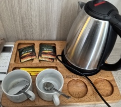- общий чайник, непонятно какую воду греют в нем гости, так как на дне чайника собирается неприятный налет. Я забирала чайник в номер, мыла его и кипятила покупную воду, потому что иначе пить чай было невозможно.