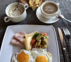 Поели тоже хорошо) вкусный стейк, бургер. Был включен завтрак, но почему-то на двоих, хотя мы доплачивали за третьего человека, ребенка 8 лет, когда бронировали номер, то есть снимали номер на троих. Впрочем завтрака хватило и троим, так как кормят плотно и вкусно 😋 ( каша и яичница на человека).