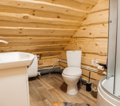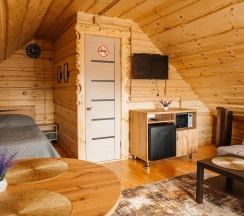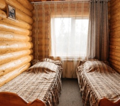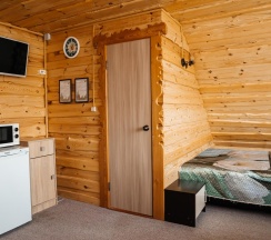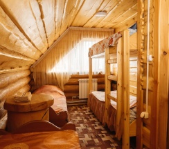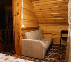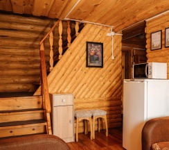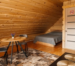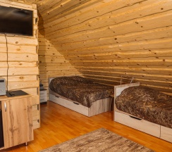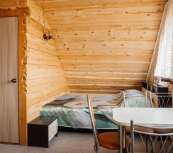 В коттедже №3 возможно проживание до 6 человек. На первом этаже расположен санузел и комната с раскладным диваном, обеденной зоной, телевизором, холодильником, электрическим чайником и чайной посудой, микроволновкой. На втором этаже общая спальная зона, где две 2-х спальные кровати, две односпальные кровати.
