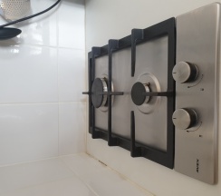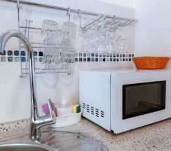газовая плита на две комфорки, микроволновка, вытяжка, мойка, посуда кухонная, столовая, чайная и стекло.