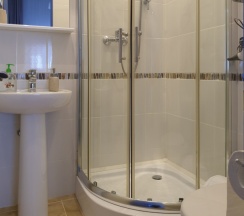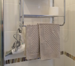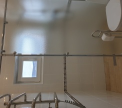 Санузел: душ со стационарной душевой перегородкой, унитаз, гигиенический душ, раковина, зеркало с полочкой и посветкой, фен, полотенцесушитель с полочкой, бумаго- и ёршедержатель).