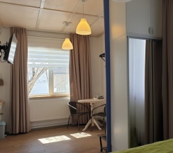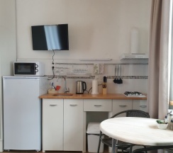 Комфортабельная студия в корпусе "К". Рассчитана на четырехместное размещение, оборудована всем необходимым для проживания - мини кухня, удобные кровати с ортопедическими матрасами, собственный санузел с душевой, а главное красивый вид на горы.