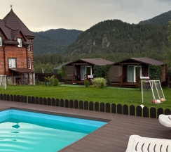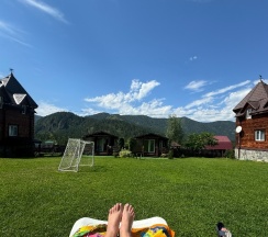И снова здравствуйте. Очередное лето и очередные мучения в поисках отдыха в РА привели нас в АлтайДача22. Реалии превзошли ожидания и желания. С первых минут прибывания стало понятно, что владельцы вкладывают душу в свое Творение . Территория ухоженная,газон мягкий и ровный. У каждого домика свой мангал, что не маловажно(как показывает практика :вечером примерно в одно время начинается жарка мяса). Мячи, батут, подогреваемый бассейн (отдельное уважение, за ним следят) входят в стоимость проживания. Домик:чисто, вся необходимая техника присутствует: кондей(он/офф), бойлер, тв, чайник, микроволновка.Пастельное белье свежее и пахнет свежестью. Кровать и подушки комфортные, есть с чем сравнить по России матушке покатался. Проблем с перебоями электроэнергии нет, что порадовало. Как ранее писалось, виды шикарные! Большую часть времени любовался видом с терассы. Мы искали отдых в тишине и мы его нашли. Не смотря на полную заселенность домиков, нет криков, оров, дискотек и прочих раздражаюх факторов. Только умиротворение постояльцы и радостная детвора. Шум трассы практически не слышен, если только прислушаться. В шаговой доступности несколько достопримечательностей. Рекомендую отведать пиццу в Печкинъ.