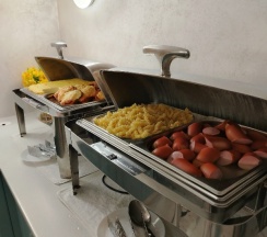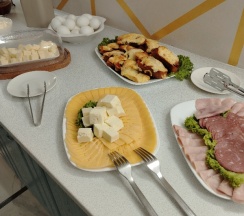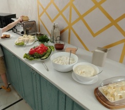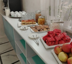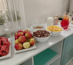 Завтраки - отдельная песня. В столовой на цокольном этаже вас встретят доброжелательные повара с золотыми руками: каши, хлопья, мюсли, овощи (свежие и запечённые), гарнир, мясное, воздушный омлет, фрукты, кофемашина для американо, капучино, латте.