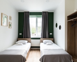 Уютная светлая комната TWIN без своего санузла (душ и туалет на две комнаты). В комнате 2 односпальные кровати 90 х 200 см, шкаф с вешалками, зеркало, полотенца, индивидуальные розетки и светильники, журнальный столик, кондиционер.