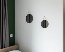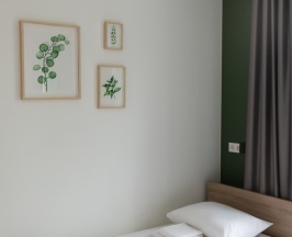 Небольшая, но очень уютная комната. Здесь двухспальная кровать 160 х 200 см, свой санузел, шкаф с вешалками, зеркало, полотенца, индивидуальные розетки и светильники, фен, кондиционер.