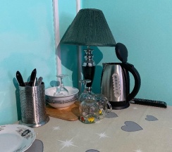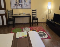 В комнате шкаф с достаточным количеством плечиков. Стол с двумя стульями, светильник, столовые приборы, разделочная доска, кружки, тарелки, электрический чайник. Телевизор расположен высоко над столом, не очень удобно. Две тумбы, две раздельные кровати. Чистое и приятное постельное белье, матрасы очень мягкие и удобные, большая и маленькая подушки. Вместительный холодильник (очень шумно работает). Из минусов в номере это розетки. Они вроде есть, но расположены очень неудобно.
