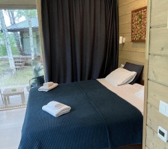 Понравилось: Тихое местечко в лесу в часе езды от города, доехать можно на любом автомобиле, территория охраняется. мы остановились в новом домике с видом на лес. интерьер и мебель свежие, все чистое, предоставили кроватку для малыша и за доп. плату разместили собаку. В доме вся посуда, холодильник, чайник, индукционная плита. возле дома мангал, шампуры и решетку могут выдать бесплатно при условии возврата в чистом виде, угли и дрова свои или за доп. плату.
