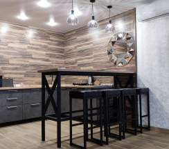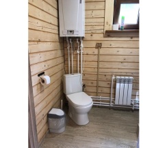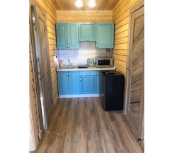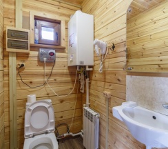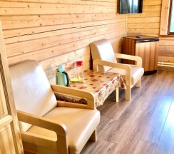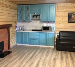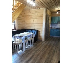 Современный коттедж оборудован всем необходимым для комфортного пребывания у нас. Большая кухня- гостиная с обеденным столом, позволит вместиться небольшой компании. На кухни есть микроволновая печь, чайник, индукционная плита, посуда, маленький холодильник.