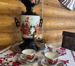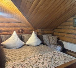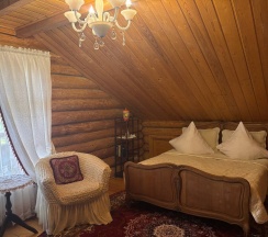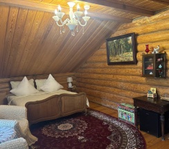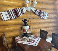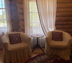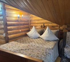 В доме три спальни – горница, светелка и клеть, изба с русской печью и бабий кут, а для закоренелых горожан, не мыслящих себя без благ цивилизации, есть потайная комната, спрятанная от посторонних глаз за массивной дверью; в ней расположены современные душевая кабина и туалет.