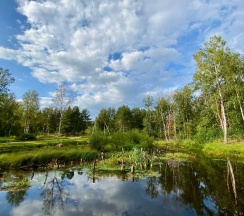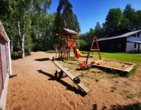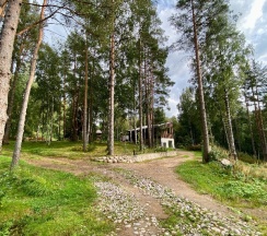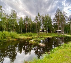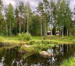 Большая ухоженная территория с симпатичным болотом в центре. Огорожена забором. Есть детская площадка.