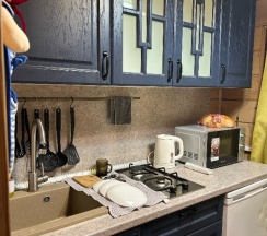 Домик очень уютный, есть все, что необходимо для жизни, включая кухню и весь кухонный скарб, ванну (не душ - ванну), достаточное количество розеток (о! какая это редкость), да еще в правильных местах, мангал и мангальные принадлежности.