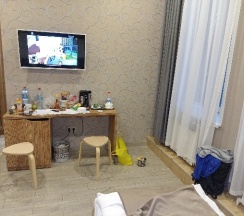 Брал эконом с удобствами. Номер чистый, тапочки, халат, индивидуальные туалетные принадлежности. В номере тепло, есть чайник с чайными принадлежностями, ТВ, кондиционер, мини-холодильник.