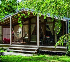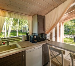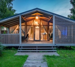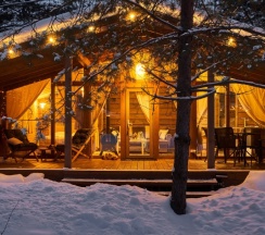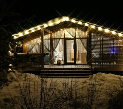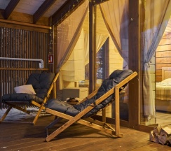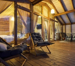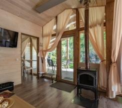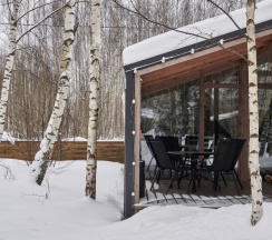 Дом для комфортного семейного отдыха на 2 - 4 человека. Общая площадь 85 кв.м (25 терраса и 60 кв.м. основная жилая площадь из двух комнат и 2х террас). У вас в распоряжении кухонная зона, душ, туалет, зал, разделённый ширмой на спальню и гостиную, есть кондиционер, печь-камин, система автоматического поддержания температуры, шторы блэкаут.