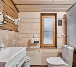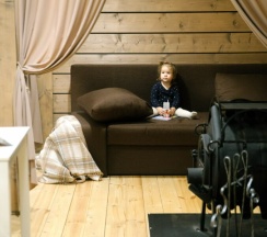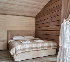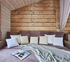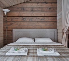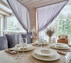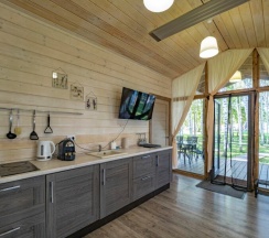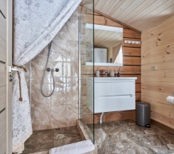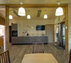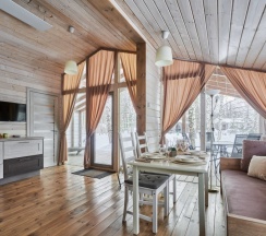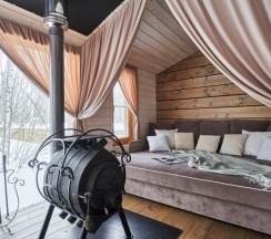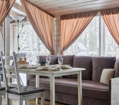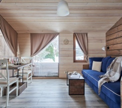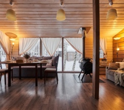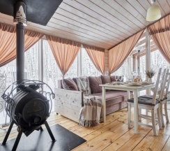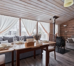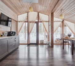 Дом для комфортного семейного отдыха на 6-8 человек. Общая площадь 100 кв.м (24 терраса и 76 кв.м. основная жилая площадь). У вас в распоряжении кухонная зона, душ с тёплыми полами, два туалета, три отдельных спальни, зал с двумя диванами-кроватями, печь-камин, система автоматического поддержания температуры, шторы блэкаут.