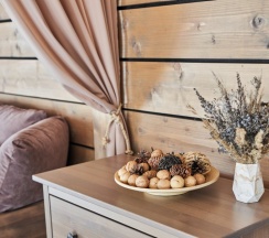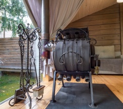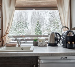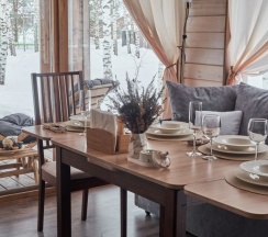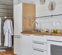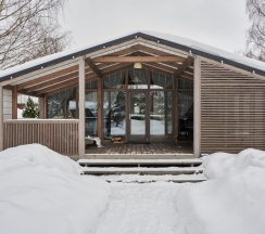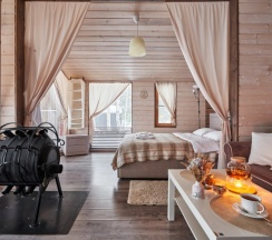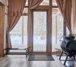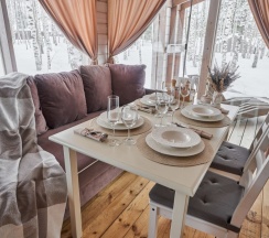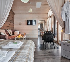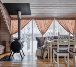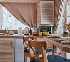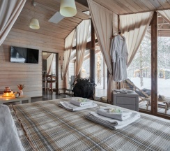 Дом для комфортного семейного отдыха на 2-4 человек. Общая площадь 60 кв.м (24 терраса и 36 кв.м. основная жилая площадь). У вас в распоряжении кухонная зона, ванная комната с тёплыми полами, туалет, общая комната с двуспальной кроватью и дополнительным спальным местом, отделённым ширмой, печь-камин, система автоматического поддержания температуры, шторы блэкаут.