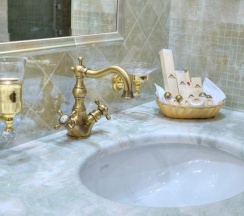 Ванная комната, оформленная в мраморном и мозаичном стиле, порадует вас современным оборудованием и изящным стильным интерьером. Сантехнику, выполненную из 18-ти каратного золота, украшают стразы Swarovski. Большая ванная из натурального мрамора, шелковые обои на стенах номера, картины современных художников и авторские аксессуары оживляют помещение и создают неповторимый стиль.