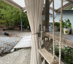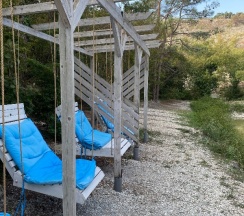 Уединенное, атмосферное местечко недалеко от шумного Геленджика. Были в будни, народу было мало. Удобная, деревянная лестница ведет на череду небольших, галечных пляжей. На первом пляжу стоят деревянные шезлонги.