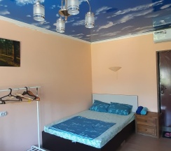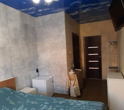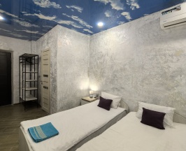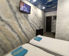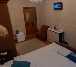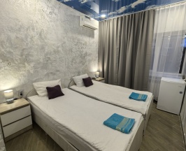 К вашему вниманию двухместный номер-стандарт. Все условия для комфортного проживания: кондиционер, мебель, вся бытовая кухонная техника, WiFi. В номере свой холодильник, также и ванная комната своя, кухня на 3 двухместных номера. Предоставляем ванные принадлежности, тапочки. Вода горячая и холодная круглосуточно. Номер закрывается на ключ.