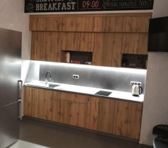 В кухне есть все необходимое для хранения и приготовления пиши (холодильник, варочная панель, печь свч, чайник, посуда) и телевизор для отдыха. Всегда есть питьевая вода в куллере.