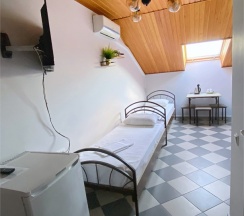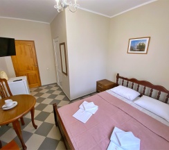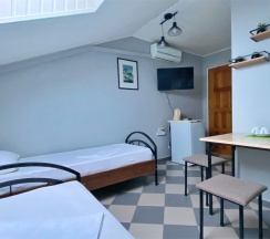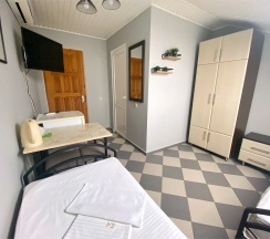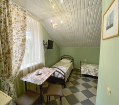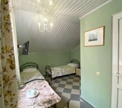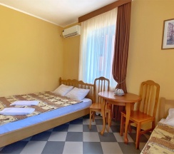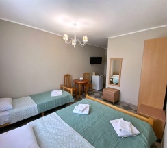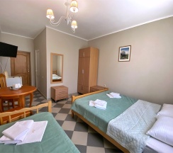 Трёхместный номер класса стандарт с собственной ванной комнатой. Оснащение номера: три односпальные кровати, три прикроватные тумбы, шкаф для вещей, обеденный стол, три стула, телевизор, сплит-система, холодильник, электрический чайник, посуда для чаепития, сан.узел (туалет, душ, раковина)