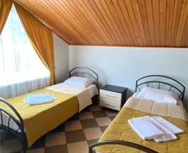 Двухместный номер класса стандарт с собственной ванной комнатой. Оснащение номера: две односпальные кровати, две прикроватные тумбы, шкаф для вещей, обеденный стол, два стула, телевизор, сплит-система, холодильник, электрический чайник, посуда для чаепития, сан.узел (туалет, душ, раковина)