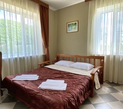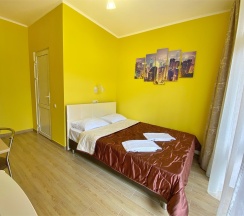 Двухместный номер класса комфорт с собственной ванной комнатой. Оснащение номера: одна двуспальная кровать, две прикроватные тумбы, шкаф для вещей, обеденный стол, два стула, телевизор, сплит-система, холодильник, электрический чайник, посуда для чаепития, сан.узел (туалет, душ, раковина)