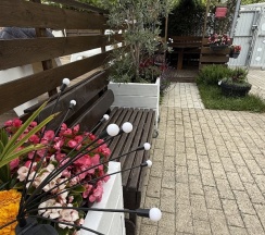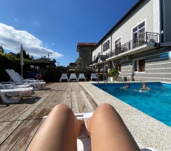 Отель, в который хочется вернуться и мы так и сделали, были тут дважды с разницей в неделю. Местоположение на другой стороне села от сильного трафика, спокойнее и зеленее. Сетевые магазины в шаговой доступности, в кафе ездили неск раз, минут 10-15 на машине — понравилась «Веранда». В отеле встретили нас прекрасно, персонал ВЕСЬ внимателен на протяжении всего отдыха. Здесь идеально с детьми, им большое внимание — при заселении оба раза вручили дочке подарочный детский набор, каждый вечер с 17:00 была детская анимация (даже когда наш ребёнок был один из детей — с ней всё равно проводили время 🥹🫶🏽 и ей было весело) во время анимации маленькие угощения детям, мультфильмы на проекторе. Отель как новый, чувствуешь себя максимально комфортно что на территории, что в номерах. Супер уютно. Чистота и порядок везде! Хорошо работающий WI-FI (что нам было важно), душ с хорошим напором воды, вода горячая, а не еле теплая. Удобнейшие спальные места с хорошими матрасами и подушками, раскладной большой диван для ребёнка. У нас был номер с балконом оба раза, спали с открытым, никто не шумел) Завтраки включены в стоимость — есть всё, что нужно! Обеды за отдельную стоимость тоже брали пару раз, советую, кухня — по домашнему вкусно и очень сытно. Есть зона столовой (чай/кофе/микроволновая печь и кипяток всегда), большая качель, детский домик с игрушками, две беседки, мангальная зона (уголь, розжиг, решетки) с раковиной рядом. Мясо готовили с большим удовольствием! А, и ещё, при отеле прикольный фудтрак (закуски, пицца, роллы. что-то перекусить спокойно можно и там) Ну и конечно же бассейн, который ДЕЙСТВИТЕЛЬНО с подогревом, шезлонги, рядом тут же душевая и уборная. На море чуть ли не каждый час Вас возит свой автобус, мы там были всего раз, пляж из камней не для нас 😁 Минусов не нашла вообще, и мы очень удивились, насколько продумана каждая мелочь здесь, которых ещё масса и не хватит места здесь описать. Обязательно приедем ещё и будем советовать всем. А Бабушке Камбале процветания!
