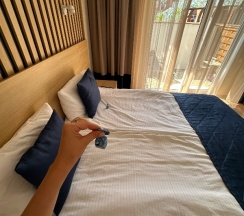 Очень понравился отель, отношения на пять звезд, персонал очень вежливый, в номерах чисто и уютно, при заселении подарили подарок- пляжную сумочку, кормили вкусно, приезжали с маленьким ребенком и не пожалели, дали кроватку- манеж ❤️ и много детских книг, при выезде перед дорогой еще пирожками накормили🫶🏻🫂 спасибо за гостеприимство 🌸