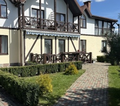 Близко от аэропорта минут 15 на машине. Расположен в посёлке Малиновка, но открывая калитку, вы уже оказываетесь в Европе. Вкусный завтрак, готовят по заказу, красивые интерьеры, бассейн и зелёная ухоженная территория.