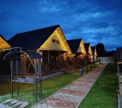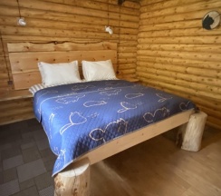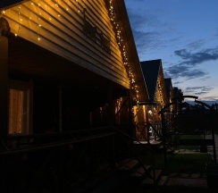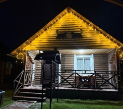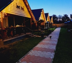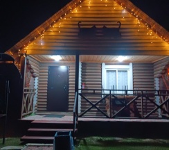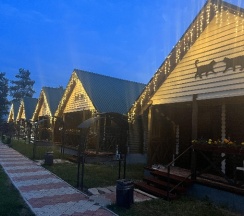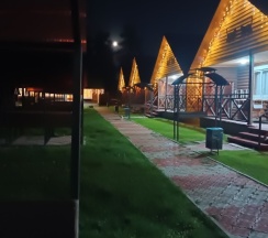 Чистый домик, всё продумано.Возле каждого домика беседка и мангал. В домике чисто, есть холодильник. В ванной фен, полотенца , набор гель и шампунь, зубная щетка. Большая кровать. Под кроватью выдвижные вместительные ящики. На территории находится большая кухня с посудой, микроволновкой. Большая территория. Есть детская площадка.Очень приветливый хозяин.