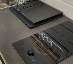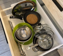 На кухне все, что нужно было под рукой. Плита индукционная удобная, есть кофейник, масло-соль-сахар в шкафу.