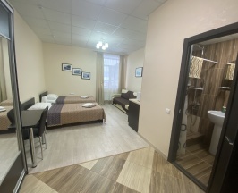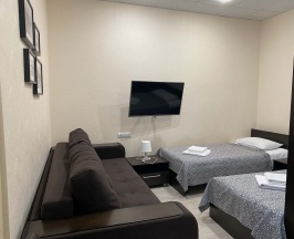 Номер "Комфорт" с двумя отдельными кроватями, диваном и балконом, наполнен светом и воздухом. Возможно размещение до 3-4 человек.Оборудован мини-кухней и ванной комнатой.