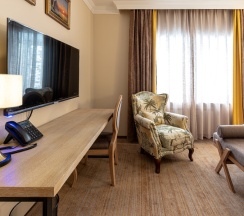 Номер категории Junior Suite c удобной и просторной планировкой в 34.4 кв. м. и современным оснащением: телевизор с диагональю 55 дюймов, индивидуальный кондиционер, бесплатный WiFi, комфортная кровать, рабочий стол.