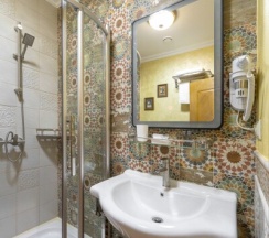 Ванная комната оборудована в соответствии с современными тенденциями, в распоряжении гостей: душевая, туалет, зеркало с подсветкой, фен и бесплатные туалетные принадлежности, а также мягкие банные халаты, полотенца и тапочки.