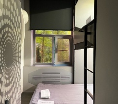В комнатах высокие потолки, так что даже на втором ярусе просторно и удобно. Есть индивидуальные шкафчики с кодом, а на кроватях плотные заслонки. Комфортно!