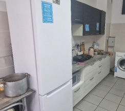 Сантехника хорошего качества и была вся рабочая. Просторная кухня. Есть 2 стола на 3 человека и отдельная барная стойка для одиночек. Есть холодильник и 2 микноволновки и электроплита. Посуды достаточно. Теперь к минусам - совершенно нет ложек/вилок☝️ стены очень тонкие и вы будете слышать соседей.