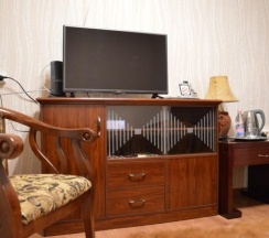 В номере: Двуспальная кровать, Электронный замок, ЖК-телевизор, Фен, Ежедневная уборка, Высокоскоростной интернет, Душ, Набор для приготовления чая и кофе, Бутилированная вода, Косметические принадлежности, Халат и тапочки, Кондиционер.