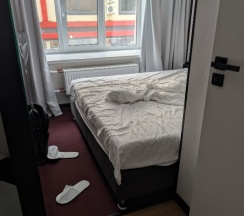 Место хорошее, вид из окна ужасный, номер не большой но чистый. Всё есть - тапочки, полотенца, зубная паста, щётка,чай.
