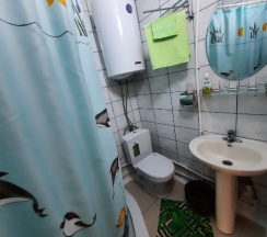 Есть всё необходимое - тапки, светильники, телевизор, холодильник, чайник с бокалами. В туалете жидкое мыло, туалетная бумага и даже освежитель воздуха.