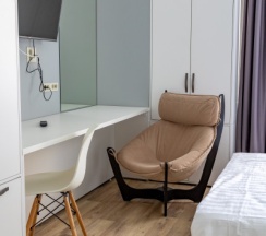В номере есть большая двуспальная кровать, детская кровать для ребенка до 15-ти лет, телевизор, шкафы для одежды, стол со стульями, удобное кресло для отдыха, бесплатный WI-FI, кондиционер.