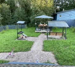 Брали 2 домика на одном участке: два дома, 2 мангала (шампуры и решетки есть), беседка открытая и беседка крытая. Заезд без ресепшена - по кодам на дверях.