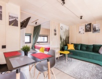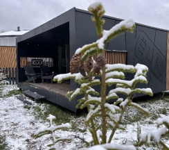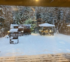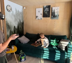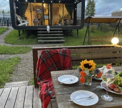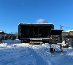 Хорошее место. Отдыхали семьей с двумя детьми. Старшему 5 лет, младшему - полтора. Для малыша нам предоставили детскую кроватку! Переживали очень, что будет холодно, тк на улице -17! Но к нашему удивлению было тепло и даже жарковато. В домике был телевизор с подписками, кофеварка, заварник (это из необычного). Посудомойка с таблетками, стиралка с порошком, настольные игры и даже карандаши!