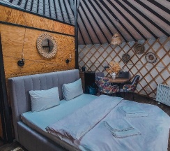 Жили в очень уютной юрте Алтай с террасой - просторная, светлая, теплая, есть кондиционер, полностью оборудованная мини-кухня, красивая обеденная зона, горячая вода, санузел с душем, отличный вай-фай) Для детей есть спальная зона под куполом юрты - ребенок был просто в восторге! Ночью домики и юрты подсвечиваются - смотрится волшебно)